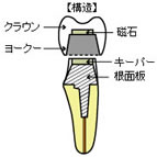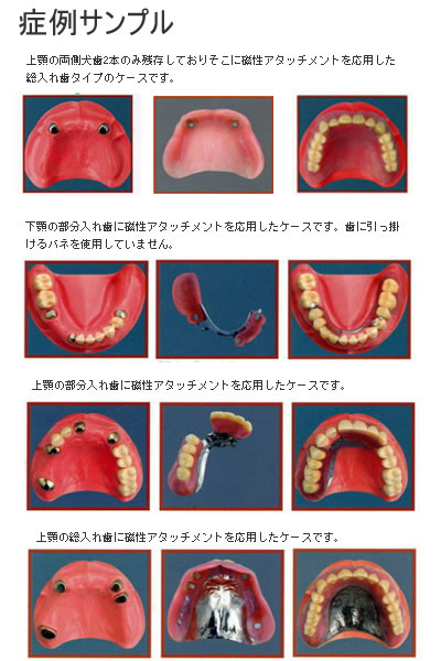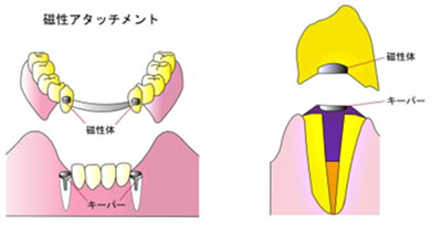 高性能の磁石と、磁石の力を維持するステンレス鋼との組み合わせで作られています。カップ型とサンドイッチ型の2種類のヨークがあり、デンチャーやアタッチメントの形に合わせて使い分けられています。 磁性アタッチメントは、バリエーションが豊富です。今後は従来の入れ歯との併用により、噛み心地のよい、丈夫で扱いやすいものへと開発が進むと思われます。